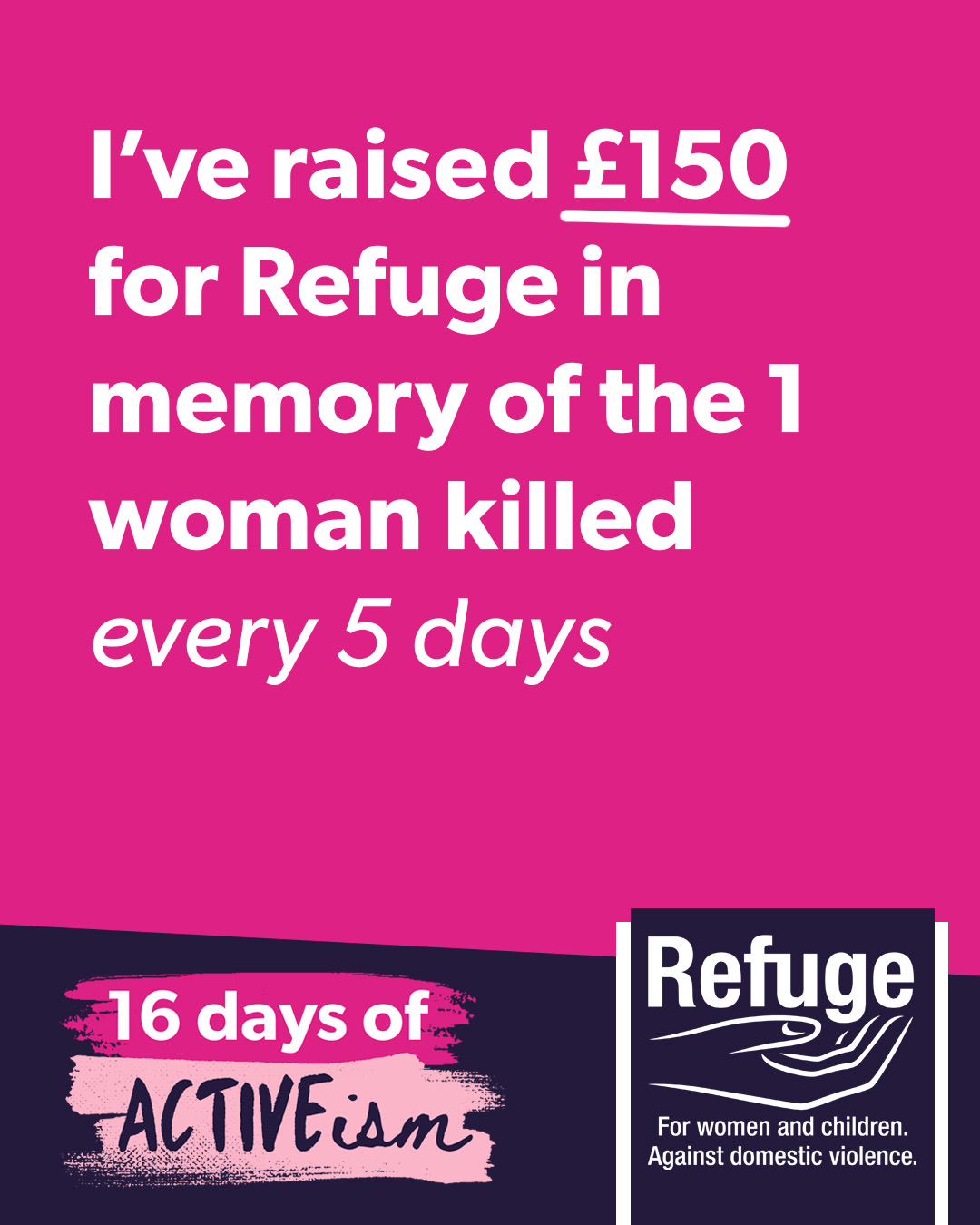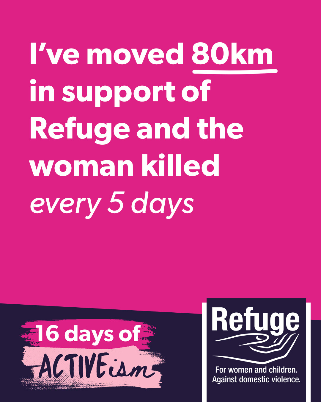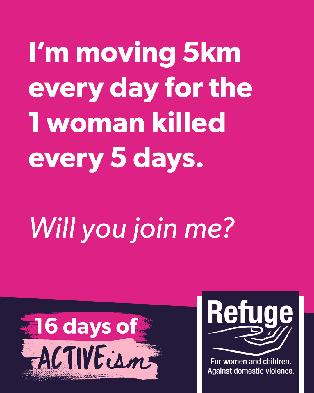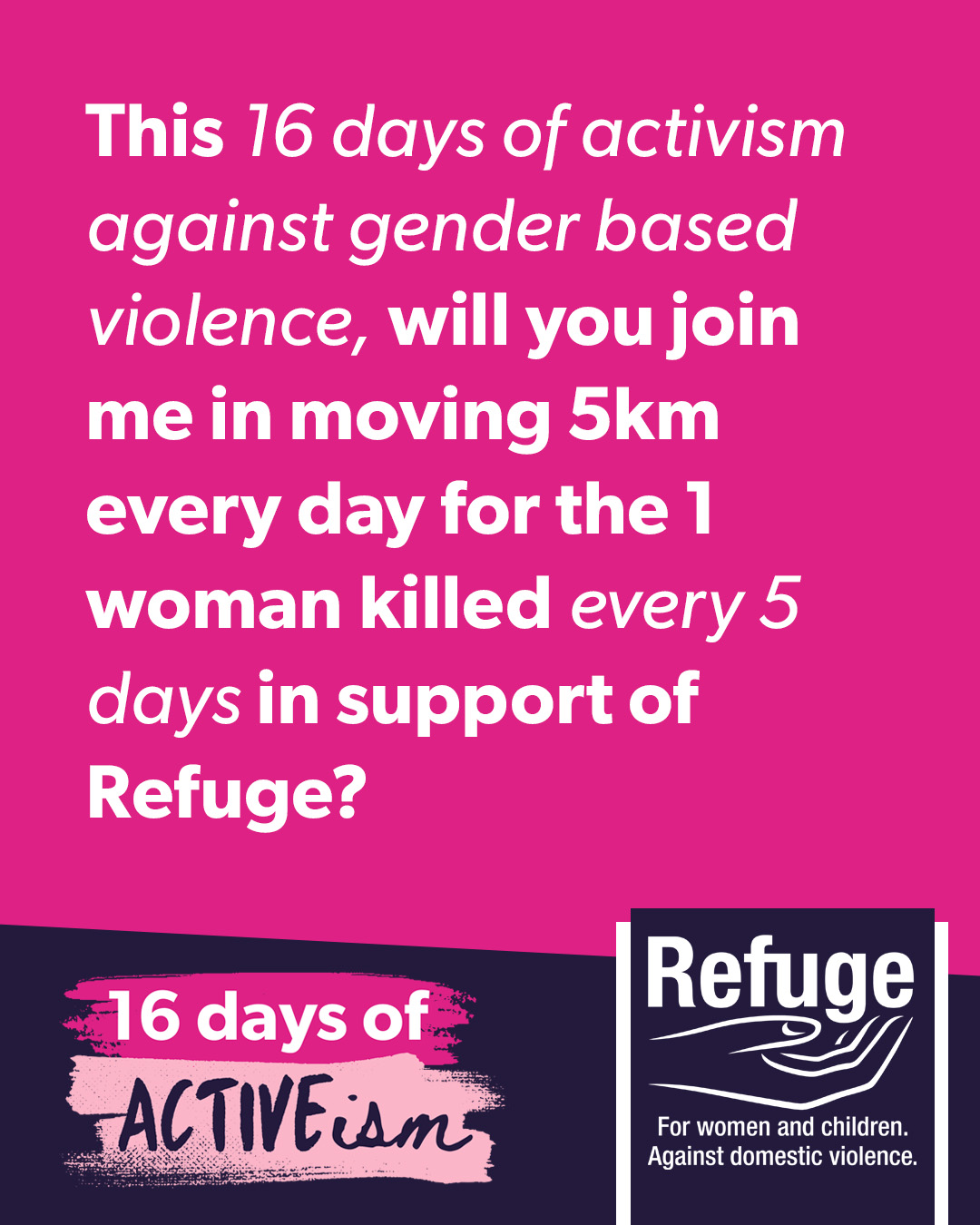 We are challenging you, our incredible supporters to raise £150 by moving 5km every day, for 16 days in memory of the 1 woman killed every 5 days. Whether you run, walk, jog, swim, cycle or roll your 5km. How you move is completely up to you.