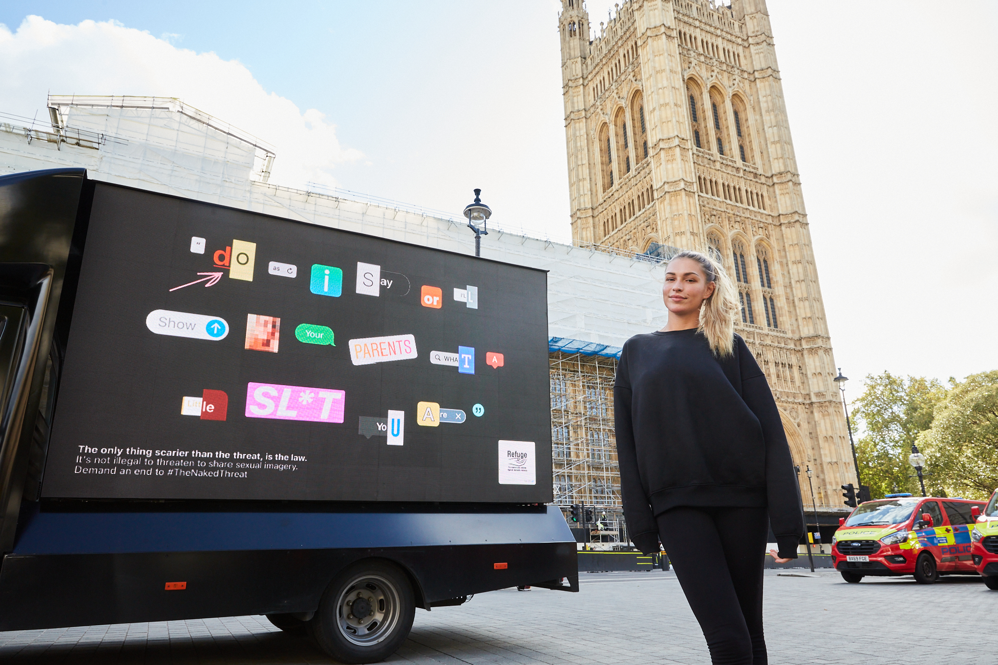 So what did we do? Refuge partnered with former civil servant and Love Island star Zara McDermott, and survivor of domestic abuse Natasha Saunders, to launch the Naked Threat ad campaign, with ad vans that drove past Parliament to get our message across. We also drove supporters to sign a letter to call for a change in the law — and 45,000 Refuge supporters signed up!